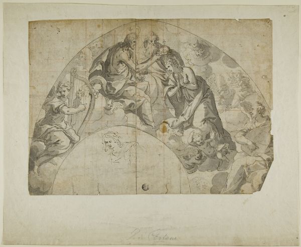 Editor: This is "Funereal Cartouche with Inscription and Sketches of Skeletons and Ornamental Details" by Baccio del Bianco, created in 1628, using pen, pencil, ink, chalk on paper. I'm immediately struck by how morbidly playful it is, especially with the skeletons jauntily supporting the cartouche. What does this piece say to you? Curator: Well, this piece really speaks to the socio-cultural context of 17th-century Italy. The "memento mori," or the reminder of death, was a powerful motif at the time. These weren’t just morbid obsessions; they were ways of grappling with mortality, often commissioned during times of widespread disease and religious reflection. Editor: So, this piece wasn't necessarily meant to be depressing? Curator: Not necessarily. Look at where it would have been placed, perhaps above a tomb, a site for ritual and remembrance. These images reminded viewers of the transience of life, encouraging piety. Moreover, this design suggests a patron who sought to participate in a culture of commemoration, and to show wealth and sophistication through the commission of talented designers such as del Bianco. Editor: That's fascinating. I hadn't considered the potential display context and its influence. Curator: Consider also, this isn't just art for art’s sake; it's tied to institutions and the politics of imagery. How did the Church view images of death, and what kind of visual vocabulary were artists expected to employ? Editor: It's interesting how different institutions shaped the meaning and reception of the artwork. Curator: Indeed. Seeing the artwork within its specific socio-historical context really adds depth to how we appreciate its meaning and the cultural values of that era. Editor: I'll definitely remember to look into the original context and forces when trying to understand a work of art from now on.