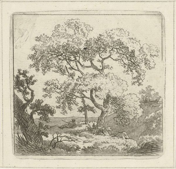 Curator: What a striking image; Salomon Gessner's "Landscapes Dedicated to Watelet" creates a sense of serene contemplation. Editor: The texture achieved with the etching technique, the way light and shadow play across the leaves, it gives it an almost dreamlike quality. Curator: I see it as a visual poem, drawing on pastoral ideals. The shepherd figure, the flock, they echo classical themes of harmony. Editor: The shepherd figure is very interesting—the line is so sharp and stark against the soft, blurred background. It creates a strong focal point. Curator: Indeed, the figure embodies a connection to nature, reflecting the Enlightenment's fascination with the natural world and its symbolism of innocence. Editor: Beyond the symbolism, the stark lines and detailed etching create an intriguing visual push and pull that is beautiful. Curator: Absolutely. Gessner invites us to reflect on our relationship with nature, mirroring the cultural values of his era. Editor: It’s the interplay of form and light, and its emotional resonance, that I find most compelling. Curator: A poignant reminder of how art captures both personal and collective ideals. Editor: An intricate dance of technique and emotion.