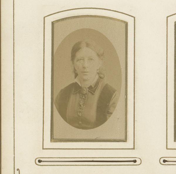 This is Emile Schweitzer's "Portret van een vrouw", a small photographic print. Photography in the 19th century was a labor-intensive and complex process, requiring meticulous attention to detail. Each print involved coating glass plates with light-sensitive emulsions, precise timing during exposure, and careful chemical development. The sepia tone we see here wasn't just an aesthetic choice, but a result of the chemical processes used to stabilize the image. While photography democratized portraiture, making it accessible to a wider audience, it also created new forms of labor and specialisation. Photographers like Schweitzer were skilled artisans, and their studios became sites of both artistic creation and commercial enterprise. Consider the social context of this portrait. It was likely commissioned, reflecting the sitter's desire to document her likeness and social standing. By appreciating the labor and technology involved in its creation, we gain a deeper understanding of the photograph as a crafted object, embedded in the social and economic fabric of its time.