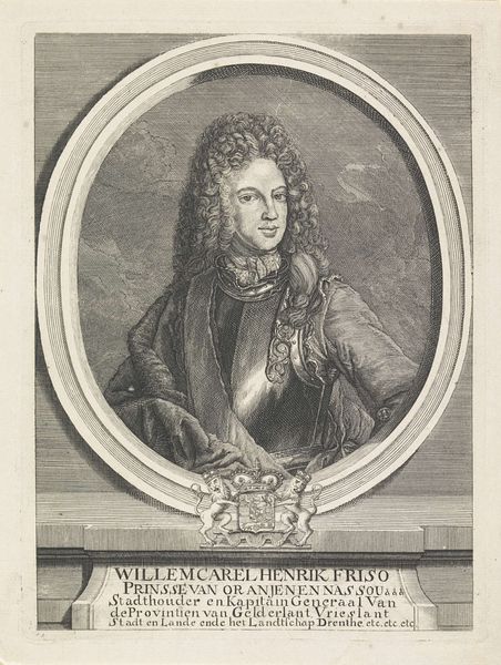 Editor: This engraving, "Portrait of John Churchill, Duke of Marlborough," made sometime between 1701 and 1731 by Pieter van Gunst, has a real sense of imposing grandeur. He looks powerful, in his armor, against what seems to be a battle scene in the background. What do you make of it? Curator: Oh, this! To me, it whispers tales of ambition, doesn't it? Look at the composition. Marlborough isn't just *standing* there; he’s *commanding* attention. And those flowing robes, that absurdly magnificent wig - they're not about comfort, darling, they're about constructing an image. It's Baroque excess turned up to eleven. The inscription, that elaborate Latin, serves as a frame that invites us to recognize him as a classical hero of sorts. Does the theatrical backdrop evoke specific military victories, do you think, or something more? Editor: Hmm, I didn't consider the inscription as framing the image like that... interesting! I see your point about the excess, especially with that wig. Do you think the artist was trying to subtly critique that aspect of the Duke? Curator: A critique? Perhaps, my dear! Or perhaps it was simply mirroring the times, indulging in the dramatic flair that defined the era. Remember, portraiture then was about crafting a legacy, building a brand if you will. But, isn’t there always an interesting dance between flattery and subtle commentary when portraying those in power? Van Gunst has walked the tightrope skillfully, wouldn’t you say? Editor: I see the tightrope walk now. Thanks, I definitely have a new appreciation for how carefully these images were constructed! Curator: My pleasure. It's been grand, haven't we learned to never judge a Duke by his wig. Or maybe… always judge them?