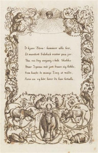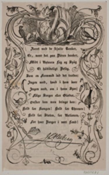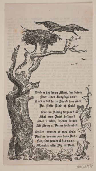 Carl Peter Theodor Rothweiler created this print, “Indramning med en lærke og blomster”, which translates to "Framing with a lark and flowers", using etching, a printmaking technique that dates back to the early 16th century. The process begins with a metal plate, traditionally copper, covered with a waxy ground. Rothweiler would have scratched the design into this ground with a needle, exposing the metal underneath. The plate is then immersed in acid, which bites into the exposed lines, creating grooves. The depth of these grooves determines how much ink they hold, and how dark the lines appear in the final print. The image depicts a lark in flight above a field of flowers, surrounding a poem written in Danish. The texture of the etching lends a delicate, almost fragile quality to the lines, enhancing the pastoral scene. The labor-intensive nature of etching, with its meticulous drawing and chemical processes, is far removed from today’s digital reproduction. This print speaks to a time when such crafted images held particular cultural value, bridging art and the appreciation of nature.