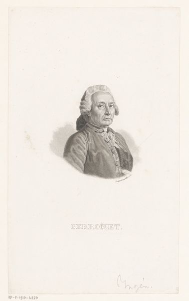 Editor: Here we have a piece entitled "Portret van F. Armand," an engraving from between 1801 and 1847, created by Pierre François Bertonnier. There's a quiet dignity about the subject, and the delicate lines give it an almost ethereal quality. What stands out to you in this work? Curator: What immediately catches my eye is how Bertonnier uses the visual language of Neoclassicism to depict F. Armand. This wasn't just about replicating appearances; it was about encoding status and conveying specific values. The symmetry, the clear lines, and the restrained emotion – these all speak to a desire for order and rationality. Editor: Order, yes, I definitely see that in the composition. But what about the specific symbolism? The subject is wearing what looks like religious attire. Curator: Indeed. The clothing immediately places him within a specific societal role. And consider the medal he's wearing – a clear marker of achievement and recognition within his community, imbuing this portrait with further layers of meaning. What do you think this medal communicates to its viewers? Editor: Perhaps the medal alludes to service and merit, emphasizing his contribution to society? It almost seems intended to portray Armand as an upstanding individual, even a pillar of the community. Curator: Precisely! Bertonnier has harnessed these symbols to construct a very deliberate image. By recognizing and understanding these visual cues, we gain deeper insights into the world the artist was creating and the message he was conveying. Editor: It’s amazing how much meaning can be packed into a single image. Thanks for helping me to unlock this portrait's historical context! Curator: My pleasure! It's these layers of visual history and meaning that make studying art so rewarding.