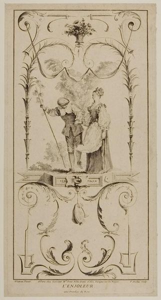Curator: The first thing that strikes me about this piece is how light and playful it is. The swirling foliage and the delicate figures almost seem to dance on the page. Editor: Indeed! This plate, titled "The Wheedling Lover," comes to us from the hand of Pierre Alexandre Aveline, a French artist active in the first half of the 18th century. The print now resides at the Harvard Art Museums. Curator: "Wheedling" is such a great word for it, isn't it? Look at the way the man is leaning in, offering a flower. I can almost hear his sweet talk. Editor: Yes, there's a clear power dynamic at play. One wonders about the social context of such courtship rituals, especially considering the print's potential use in interior decoration or as part of a larger series depicting social mores. Curator: It also makes me think about performance. We're all acting, aren't we? Putting on a show to get what we want. Editor: That's a great point! Ultimately, I find it fascinating how seemingly lighthearted images can open up complex discussions about society, status, and human relationships. Curator: Absolutely. It is fun to look at and full of deeper meanings too.