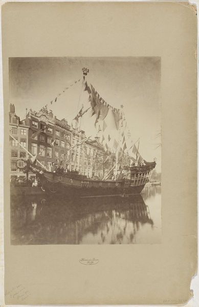 Curator: This albumen print captures "Het schip 't Willemijntje op de Herengracht tijdens de Aprilfeesten van 1887," or the ship 't Willemijntje on the Herengracht during the April festivals of 1887. Henri de Louw is the photographer, and the work now resides here at the Rijksmuseum. What are your first impressions? Editor: Well, beyond its rather muted sepia tones, it strikes me as remarkably celebratory! There are flags everywhere and such a palpable sense of civic pride. It makes me wonder, what exactly were these April Festivals commemorating? Curator: Indeed! Civic pride and historical memory intertwine here. The Aprilfeesten were a series of events celebrating national identity, and nautical symbolism was powerful. Ships had long carried heavy symbolic weight related to exploration, commerce, and defense of the nation. I would further add that ships like these represent societal voyages and progress. Editor: So, this photograph isn't just a document; it's an active participant in shaping public memory. Looking at the faces along the ship’s deck—although difficult to make out with total clarity, what social strata are depicted? Is this a wholly democratic picture, or are we witnessing a staged scene that reveals underlying social structures? Curator: That's an astute question. There is a structured quality to it. The photograph would appeal to elites in Dutch society—the ship on the canal presents an ordered view of things during an important celebration for the elites. It is intended as more formal commemoration for public audiences than as a representation of the lower class. The very staging feels carefully designed to broadcast power and stability through what we could call, cultural performances. Editor: And to that point, what does the presence of this kind of display reveal about the cultural power dynamics in Amsterdam at that moment? Was this an attempt to project unity, or was it highlighting the divisions beneath the surface? Curator: Certainly a projection of unity and continuity, however one that elides any deep social tensions that always exist below a surface-level image such as this one. To further press on this discussion about display, this form of organized visual display can unite and elide tensions, as they become an experience that connects participants together for longer time horizons. It’s important to recall such images have utility to promote particular worldviews through repeated experience of them. Editor: An important aspect that the photograph showcases but that is not obvious, is the display for those physically there on the ground, where everyone involved in creating, sharing, and absorbing these cultural signals felt united and of the same time-historical space. A very successful image indeed, as its echoes remain! Curator: Exactly. The image endures, a symbol continuing to invite reflection about both Dutch history and photographic communication itself. Thank you for shedding some light on this beautiful photograph, 'Het schip 't Willemijntje op de Herengracht tijdens de Aprilfeesten van 1887', at the Rijksmuseum.