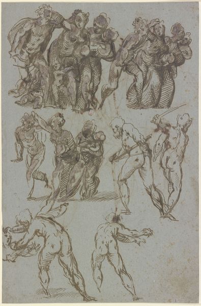 Palma il Giovane created this drawing entitled "Two Soldiers Crowned by Victory" around 1600 using pen and brown ink with brown wash on paper. The composition is structured by a series of sketches focusing on the central image of two soldiers. Palma uses line and wash to create depth and movement, with figures arranged in dynamic poses across the sheet. The brown monochrome palette brings a sense of classical antiquity, drawing us into a world of historical or mythological narrative. The act of crowning by the winged figure of Victory is visually striking. It raises questions about the nature of triumph and authority. The repetitive sketches of figures interacting suggest the artist’s exploration of themes like conflict, camaraderie, and recognition. Consider how the artist uses the formal elements to play with semiotic meanings. What cultural codes are embedded in the imagery of soldiers and victory? What fixed meanings is Palma il Giovane trying to challenge?