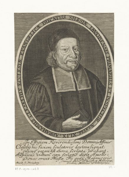 Editor: Here we have a print entitled "Portret van Johann Fischer," made sometime between 1705 and 1733 by Martin Bernigeroth. The level of detail achieved through engraving is fascinating! The mood strikes me as rather formal, almost severe. What catches your eye? Curator: The stillness, wouldn't you agree? The subject, a man of evident learning and standing, holds a book, but his gaze suggests contemplation rather than active reading. Think of it less as a snapshot and more of an ideal… a projection of wisdom and piety. The Baroque era, you see, loved to use these formal portraits to show ideal versions of individuals as examples for broader society. Notice the theatrical backdrop, typical for this period. I imagine the good Herr Fischer wanted to be remembered this way, for posterity. Do you sense that performative aspect as well? Editor: I see what you mean. It does feel carefully constructed. The background details – the books, the drape – aren't quite integrated; it's like he's standing in front of a stage set. And it strikes me that printmaking democratized the Baroque portrait! It created an accessible memento of status. Curator: Precisely! And remember, portraiture at this time was intensely concerned with social signaling. Clothes, gestures, and surrounding objects – all contribute to crafting a certain message about the individual depicted. Is that message coming across, in your opinion? Editor: Definitely. It is very impressive work. Thanks! Curator: My pleasure! A fruitful dive, I'd say.