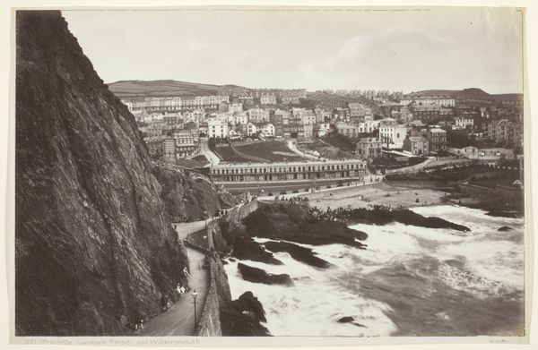 Curator: This is Giorgio Sommer's "Gezicht op de kliffen van Sorrento, Italië," a stunning albumen print that gives us a view of the Italian coastline captured somewhere between 1857 and 1914. Editor: There's a stark, almost melancholy beauty to it. The contrast between the light-colored buildings and the rugged cliffs creates a striking visual tension. Curator: Absolutely. Sommer uses a tight composition and strong contrast here, framing the built environment against nature to examine their formal interplay. Notice the detail afforded by the albumen process; one sees the way architectural forms intersect with the natural rock formations of the cliffs. Editor: That visual tension makes me think about how these luxury properties came to be situated in such dramatic environments. Sommer's vantage point underscores the power dynamic between the wealthy and their surroundings. Sorrento, as a vacation spot, served as a playground for privileged travelers at this time. Curator: That’s a fair point, although Sommer's intention, based on the stylistic and formal techniques he employed, was to emphasize a purely aesthetic, rather than socioeconomic commentary. He aligns more closely with pictorialism’s emphasis on artful arrangement than social critique. Editor: I wouldn't disregard the impact of Orientalism either. There is a tendency of travelers from the West towards romanticizing foreign locations. It's difficult not to look at the piece as part of the long colonial gaze imposed by the West. Curator: Yes, it’s a relevant context, but consider his deployment of light and shadow; Sommer is playing with those to emphasize form, not to deliver cultural commentary, per se. We might interpret the image as a comment on our human attempts to co-exist with natural geological processes. Editor: I still can't detach myself from that inherent conflict, but appreciate your articulation about the photographic techniques, and the relationship between light and shadow in the landscape. Curator: And I concede the inherent limitations of purely formal interpretation and how contextual understanding enriches readings.