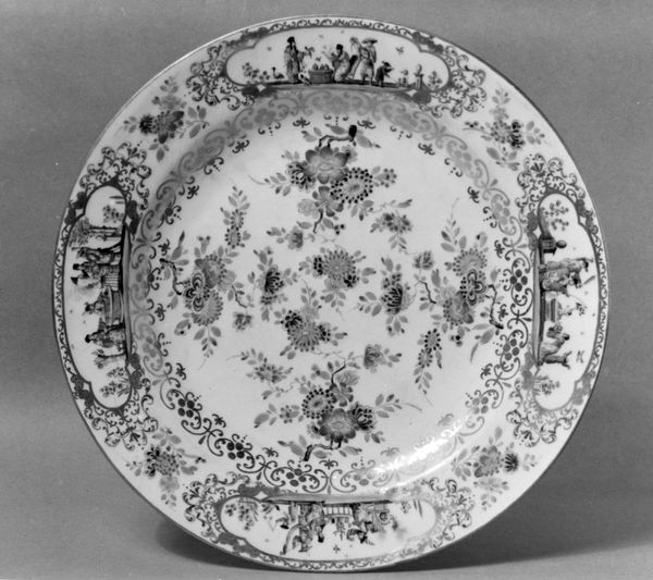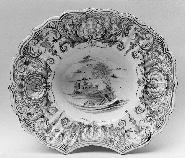 Editor: So, this ceramic "Fruit Dish," crafted sometime between 1765 and 1775 by the Dreye Porceleyne Flesschen, gives off a light, playful vibe. The Rococo style, the floral arrangements, the bird perched on top…it feels so celebratory! What strikes you most when you look at this piece? Curator: Oh, darling, this isn't just a dish; it's a flirtation with form! Think about it: they’re taking a practical object and lavishing it with a wild, untamed garden. The asymmetry! The audacious curves of the rim practically dance, don’t they? But here’s a fun question: what kind of story do you think those somewhat randomly placed, odd motifs around the edge are trying to tell us? Are they mere ornamentation, or is there a hidden code we’re missing? Editor: That's fascinating, I hadn’t thought about the elements around the edges as trying to suggest something narrative, beyond their decorative qualities. Perhaps, together with the central display, they express a feeling, rather than a set narrative. How do you think it compares with other works of decorative art from the Rococo era? Curator: Well, Rococo loves excess, doesn't it? This dish echoes that with its abundant floral displays, but it’s also grounded by its purpose, isn’t it? It's like a controlled explosion of beauty. Compared to, say, a fully gilded and ornamented piece of furniture from the period, there's a sense of whimsy here, a touch of restrained madness! Editor: I love that – a touch of restrained madness! Looking at it that way, the bird and the asymmetrical design seem much more rebellious and characterful. Curator: Exactly! And isn't that the best kind of art? The kind that invites you to peek beneath the pretty surface and find something wonderfully subversive? Editor: Absolutely. It’s like this dish is whispering a secret, daring you to join the party! Curator: Indeed. Now, I will look at fruit bowls in a completely different way, next time.