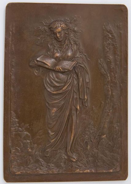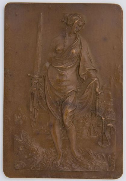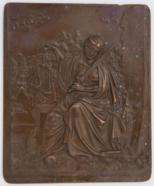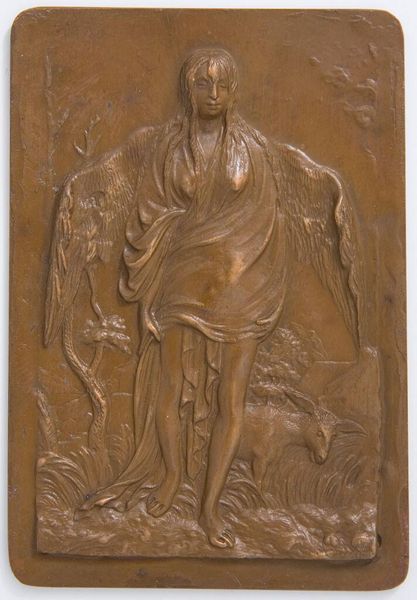 Curator: Here we have a bronze relief titled "Temperance" from "The Seven Virtues" series, by an anonymous artist. It's a small piece, only about 8 by 5.7 centimeters. Editor: It's got this old soul vibe, right? Like a quiet strength about it. Bronze can feel so solid, but this figure, she’s so graceful, like water in a way. Curator: The pouring of water from one vessel to another is a classic symbol of temperance, of course. But consider, too, the socio-political climate that often influenced the creation of virtue allegories. Editor: Sure, it's about balance, but it's also about movement. The drapery swirls around her leg, that tree beside her almost looks alive. Curator: Absolutely. And the virtue of Temperance, especially when depicted during periods of social upheaval, served as a cultural mechanism to communicate restraint. Editor: It definitely makes me think about how much our values change, or don’t, over time. Curator: Indeed, an open question for sure. Editor: Totally, gives me something to ponder.