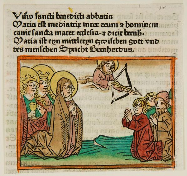 Editor: Here we have an anonymous woodcut, "Ascension of Christ." It feels almost childlike, with these flat figures and bright colors. What’s your take on its overall feeling? Curator: The directness is disarming, isn’t it? These anonymous devotional images offered, I suspect, a very intimate experience. Notice how Christ ascends—only his feet are visible! It's a promise, not a complete departure. Editor: So it's less about grand spectacle and more about personal faith? Curator: Precisely. The artist isn't trying to overwhelm you. It’s an invitation to look up, quite literally. Did you find it inviting? Editor: I do now, understanding the artist’s intention. Thanks! Curator: My pleasure. It's amazing how a little context can change everything, isn’t it?