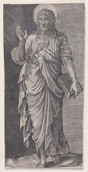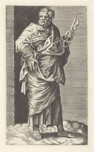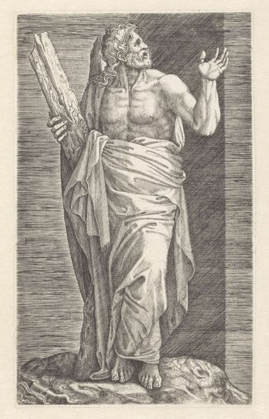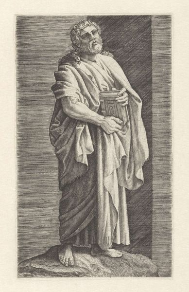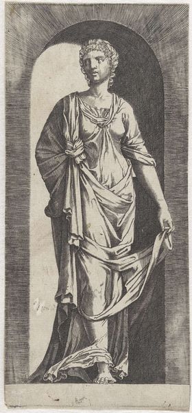 Curator: This is "Sibille op de rug gezien met het hoofd naar links geneigd," an engraving by Lambertus Suavius, likely created between 1520 and 1567. The work demonstrates intaglio techniques and embraces a Mannerist aesthetic. Editor: Right. First impression? Melancholy. She seems burdened, doesn’t she? Her head is bowed, as if contemplating something tragic. Even the light seems to avoid her face, clinging instead to the fabric of her gown. Curator: Indeed. The draping is quite significant. The way the gown is tied, almost cinched, at her back draws focus to the contrapposto, a counter-positioning that allows for the depiction of movement within a static form. Editor: You see movement, I see constraint. She’s framed within this rigid archway, as though she's trapped in some gilded cage of fate. Is that too melodramatic? Curator: Not necessarily. Sibyls, in classical antiquity, were figures of prophecy, often burdened with knowledge of the future. The downward inclination of her head may signify deep introspection or even sorrow at what she foresees. The nudity suggests vulnerability, which is a potent addition to the composition. Editor: Exactly. There's this contrast of vulnerability with the classic architectural lines. It’s both exposed and sheltered at the same time, which creates this beautiful tension. You almost feel intrusive just looking at her. Curator: The artist utilizes a fine, dense network of lines to build volume and texture, paying close attention to how light models the form. This contributes significantly to the sculpture-like quality of the figure. It's Mannerist idealisation. Editor: I agree. She's been turned into a statuesque idea, someone beautiful even when her back is to us, but she is also human, pained, which elevates the composition in my opinion. She really makes me stop to think. Curator: An ideal point to conclude our examination of this powerful piece. It offers a fascinating glimpse into Mannerist interpretations of classical themes. Editor: And a good lesson about looking closely, about observing not just what’s presented, but what it evokes within you. It also makes you look up the original stories behind the Sybils, very worthwhile.