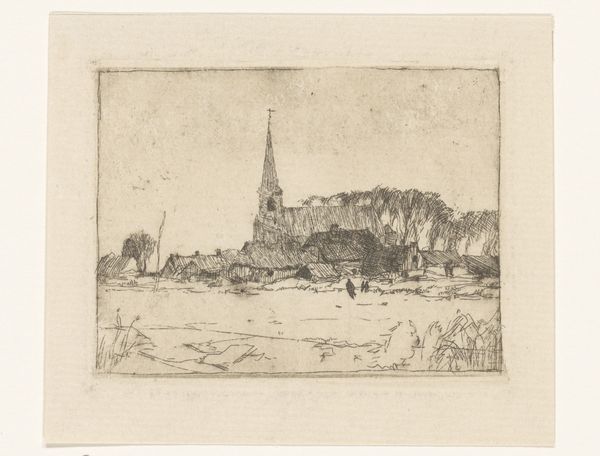 Editor: Here we have "Woningen en tempels aan de Ganges in Benares," or "Houses and temples on the Ganges in Benares," possibly from between 1914 and 1922, by Wijnand Otto Jan Nieuwenkamp. It’s an etching, rendered in ink…it has such a striking sense of depth. All of those structures stacked upon each other... It feels both meticulously planned and wonderfully organic. What catches your eye in this piece? Curator: Well, it whispers to me of journeys, both physical and spiritual. That city, Benares, now Varanasi, it's a palimpsest, isn't it? Centuries upon centuries etched onto the landscape, much like the artist's ink on the page. Look at how the temples almost seem to grow out of the rock, a testament to enduring faith. Editor: Palimpsest…I love that! It really does feel layered. Is that why the architecture feels so seamlessly integrated into the landscape? Curator: Exactly! And consider Nieuwenkamp himself – a wanderer, an artist drawn to the exotic. What was he seeking? To capture the tangible reality or something more...an essence perhaps? I wonder if this detailed yet somewhat dreamlike cityscape reveals more about his internal journey than the external one. Do you find that contrast also exists with other artists that journey abroad? Editor: That's such a compelling idea! It pushes me to look past just the "what" and to really consider the "why" behind the work. Thanks for sharing! Curator: My pleasure. Sometimes, the best art allows us to find our own reflections within it, don’t you think? To make the journey ours as well.