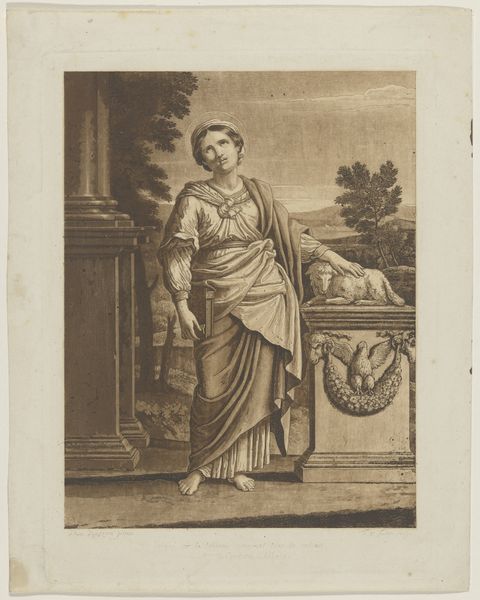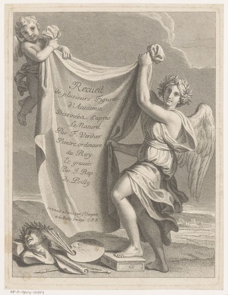 Editor: This is "Death of Lucretia" by Nicolas Gabriel Dupuis, created sometime between 1708 and 1757. It’s an engraving, and what strikes me is how theatrical it feels, almost staged. How do you interpret this work? Curator: The figure of Lucretia, for centuries, has been a powerful symbol of virtue and defiance in the face of tyranny. The image becomes less about the individual and more about the collective understanding of Roman virtue and the birth of the Republic. Editor: So, it's less about this *particular* woman and more about what she represents. How does the artist communicate that through visual cues? Curator: Notice her gaze, directed upwards. It is not an expression of fear or despair but one of resolve. This upward glance carries the weight of piety and transcendence. Editor: You're saying the gaze isn't just aesthetic; it's almost a spiritual declaration? Curator: Precisely. This is reinforced by the symbolic presence of the dagger. Here, the dagger is less an instrument of suicide and more a potent symbol of agency. What does the surrounding setting evoke? Editor: I see a stark contrast. The bedclothes are disarrayed, but there's also an almost pristine jewelry box in the background. Does that signify a clash between personal turmoil and enduring value or perhaps material versus spiritual? Curator: It could indicate an appeal to the eternal. Death in defense of honor and tradition promises earthly chaos will be balanced by divine or communal harmony. I appreciate your thoughtful observations! Editor: Thanks! Thinking about it now, I see that these visual symbols are doing more than just telling a story; they're enshrining a complex system of values.