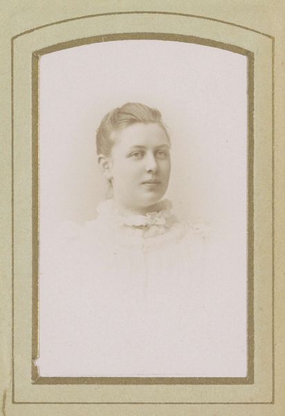 Curator: This gelatin silver print, entitled "Portret van een onbekende vrouw," was produced sometime between 1863 and 1901. The photographer was Johannes Hendrikus Kramer. Editor: What strikes me is how the lace seems to become a visual language of its own. The texture isn’t just surface detail—it speaks to something more about the materiality of femininity in this period. Curator: Precisely! Observe how the tonal range reinforces a formal hierarchy. The composition guides the eye from the softened textures of the garment toward the clearer resolution in the face. We become focused on expression. Editor: But consider what that lacework means—it’s the product of hours upon hours of tedious, skilled labor. Perhaps the portrait romanticizes what was materially taxing for so many women? I want to think about that labor embedded into the image, not just its formal effect. Curator: A valid point, certainly, but it’s difficult to ascertain from the photograph alone. Are we sure it’s not machine-made lace? Semiotics allows for a broad understanding, with less of an overreliance on contextual factors. Editor: But semiotics without acknowledging context risks detaching itself from lived experiences. Thinking about materials demands an engagement with process and labor—a much richer dialogue. What was her context for it to make her money? That is really interesting! Curator: A debate for the ages, truly! What endures for me is the almost photographic stillness married to implied psychological depth through Kramer’s delicate lighting. Editor: And I keep wondering about the hands that made the dress... and the money made because of her looks! Fascinating food for thought either way.