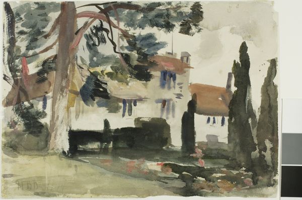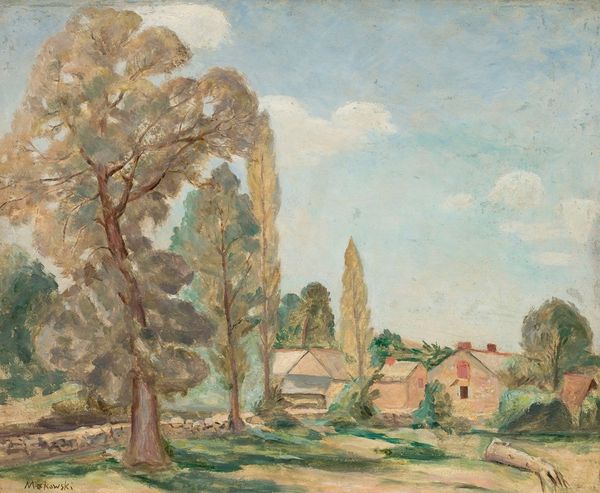 Curator: What strikes me immediately is the palpable, almost textural energy. It feels as though I could reach out and touch the very movement of the scene. Editor: Precisely! We are looking at Michel Kikoine's "Landscape", executed in oil paint, demonstrating strong Fauvist and Expressionist influences. It appears to be a work of immense tactility, which highlights, perhaps, the emotional labor embedded in the process of landscape painting itself. Curator: Indeed, the brushwork is remarkably free and bold. Note how he layers and juxtaposes colors – that vibrant green against the reds and oranges – creating both depth and visual excitement. The semiotic interplay here is interesting given his loose brush strokes which indicate feelings about nature rather than depicting its reality. Editor: Thinking of labor and material production, it is tempting to imagine what sort of brushes and paint qualities gave him these striking effects. One may consider if, at that time, the materiality of his art supplies was restricted or costly in any way? His choices and circumstances would have changed his art significantly. Curator: A valid point, yet what about the expressive nature of this style? The distortion of forms, that almost violent application of paint—it speaks of raw emotion and an unfiltered view of the world. Kikoine captures something truly primal. Editor: However, we cannot remove how the art world at the time dictated a cultural hunger for landscape works—such work made Kikoine part of the cultural narrative as a celebrated modern painter in a time of increasing urbanization and disconnection from nature. His material decisions must have catered to demand. Curator: But this is not merely a decorative work fulfilling a commercial need. Consider that intense compression of space, and those bold colour choices—it transmits a psychological tension—it draws the viewer in. Editor: It does—I acknowledge the artist’s intentions, and Kikoine's painting provides invaluable insights into the commodification of art and its link to social movements of his time. Curator: Indeed. Through colour and composition, Kikoine presents a unique, lasting interpretation of this environment and creates an exciting landscape. Editor: And understanding his artistic process embedded in material conditions and societal forces further highlights our viewing and broadens it significantly.