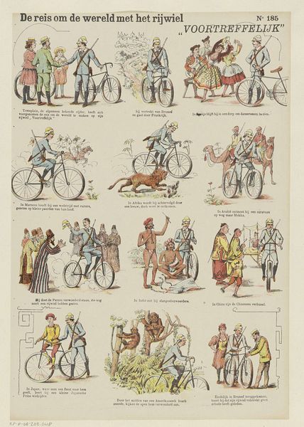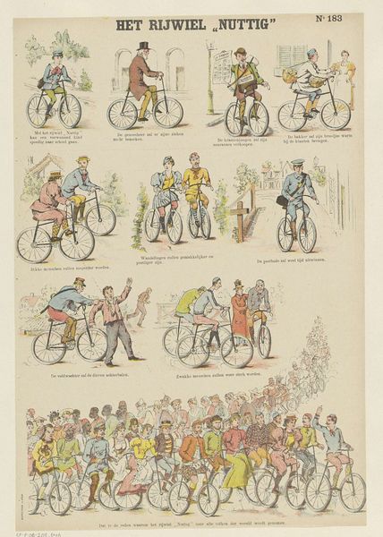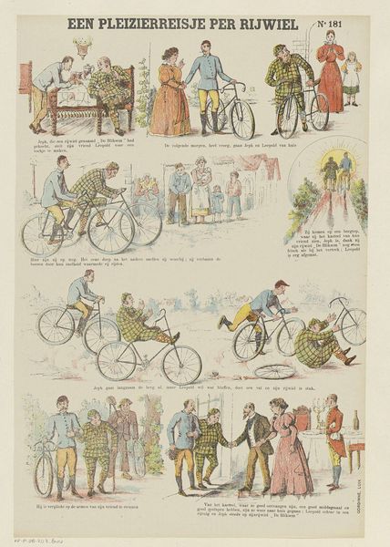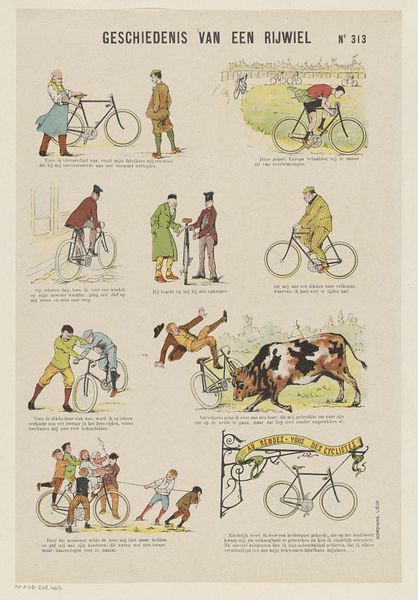 Curator: This lithograph, rendered between 1894 and 1959 and currently held here at the Rijksmuseum, is entitled "Het rijwiel 'de ononerwinnelijke'". The artist behind this piece is Gordinne. It feels like something out of a children's book; naive, light-hearted. Editor: My initial impression is one of gentle chaos, perhaps, an anticipation of comedic calamity. The figures are positioned in tiers like frames of a flip-book, each row showcasing another phase of the story. What do you know of its place within the history of cycling imagery, for example? Curator: At its core, the artwork showcases a cycling race. The bicycle is presented not just as a vehicle, but as an icon of modernity and progress, ideals embraced by the late 19th century, when cycling boomed in popularity. It depicts a visual narrative, really, about ambition, progress, but also, as you pointed out, gentle chaos. It is also a depiction of class. Editor: Yes, you can feel those aspirations intertwined with anxieties about social mobility and access. There are many of us who never were welcome in such activities, even today. And is it my imagination, or are some of these competitors destined to fail, a premonition of downfall through overreaching? This comic-strip format itself almost seems to invite class analysis through accessibility and the flattening of hierarchy within its form. Curator: It is entirely possible! And don't forget, the turn of the century was also a time of social commentary through caricature, especially within printed media. A work like this could very well act as a playful jab at the seriousness of competition or the absurdity of fixating on victory at any cost. Its creator was no doubt involved with progressive issues in Belgium. Editor: Thank you. Seeing it through that lens clarifies so much; the artwork is now charged with potential criticisms of early consumer culture wrapped up in what initially reads as simplistic humor. The very material it’s printed on seems to amplify its accessibility, refusing the high-art trappings some viewers expect. Curator: Indeed. We began by acknowledging the simple composition and naive style. Perhaps these very traits were intentional choices geared to resonate more strongly and universally during this time. Editor: So it seems even humor may carry significant ideological baggage, inviting us to unpack not just what we see but why, especially when looking at so called innocent work, to reconsider it for its social fingerprint.