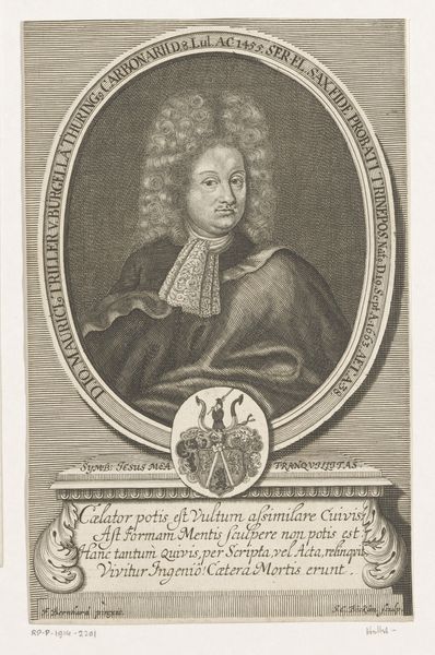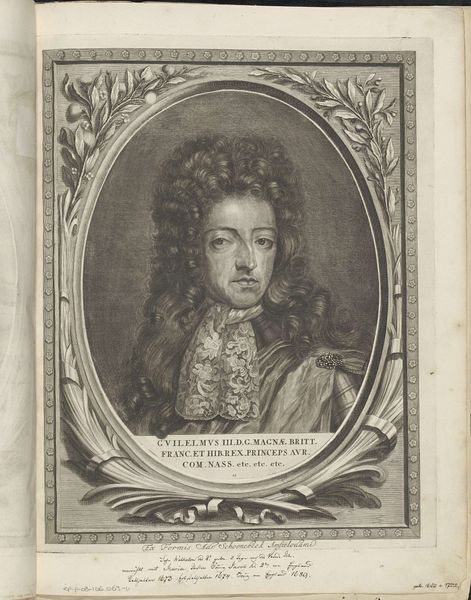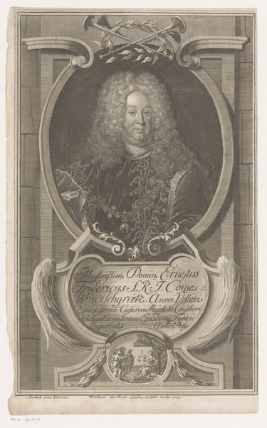 Curator: Here we have a portrait, rendered as a print, titled "Portret van Otto George von Wiedebach". Johann Christoph Boecklin completed it sometime between 1703 and 1709. The print, fitting within the Baroque style, captures Wiedebach encased by ornate detailing. Editor: It’s a striking image, isn’t it? The texture is incredible, even at a distance, with that dense, almost overwhelming wig contrasted with the cold, hard steel of the armor. I'm immediately drawn into the details of status displayed in this portrait. Curator: Indeed. The elaborate presentation signals Wiedebach's position within the socio-political structure of the era. Consider the history-painting element—portraits like this played a critical role in establishing legitimacy and consolidating power. The aristocratic taste preferred such depictions, ensuring both self-fashioning and promotion of ideology. Editor: And it's fascinating how much that ideology is tied into visual cues. The wig itself, isn’t just a fashion statement. Its imposing form symbolizes authority, even virility, amplified by its connection with established family emblems. Look at the crests ringing the central image. They’re like little heraldic echoes. Curator: Exactly. Each crest is laden with symbolic value. In those societies, an individual was partly understood through a complex family lineage and the emblems that visually narrated it. It became less about the man, perhaps, and more about the legacy. These visual statements functioned within specific protocols, reinforcing power and influencing public perception. Editor: But does it work? For modern viewers, does this still evoke that intended response, or has it been so abstracted by time and change that it just serves as another image? What parts of these visual systems, though, still resonate across centuries? I'm particularly struck by how many elements, though literally antiquated, that still have strong associations with authority. Curator: That is a critical consideration, indeed. It is, perhaps, a testimony of image persistency; or rather a reflection on our continuous and active re-shaping of images and cultural values that allows them to bear meaning across contexts. Editor: Right, it really emphasizes how powerful visual symbolism is; and how its ability to mutate allows it to remain relevant over such vast timescales. I see both fragility and lasting power here.