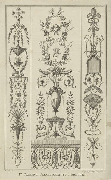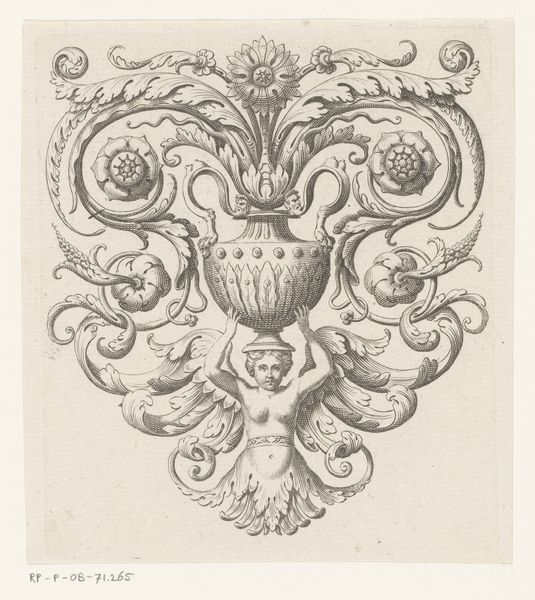Laurent Guyot created this etching titled "Arabesken met vazen en meerminnen" (Arabesques with vases and mermaids) in the late 18th century. During this period, Europe was enthralled by the exotic allure of the East, birthing the decorative arts style known as "arabesque." Guyot's work encapsulates the era's fascination with the Orient, blending it with classical motifs. This etching features mermaids, mythical figures often associated with femininity and allure. But consider how these figures, intertwined with vases and floral designs, also speak to themes of containment and display, mirroring the societal constraints placed upon women. As you observe the piece, consider how it negotiates the boundaries between the real and the imagined, the East and the West, and how it reflects the complex interplay of desire, identity, and power that characterized 18th-century Europe.