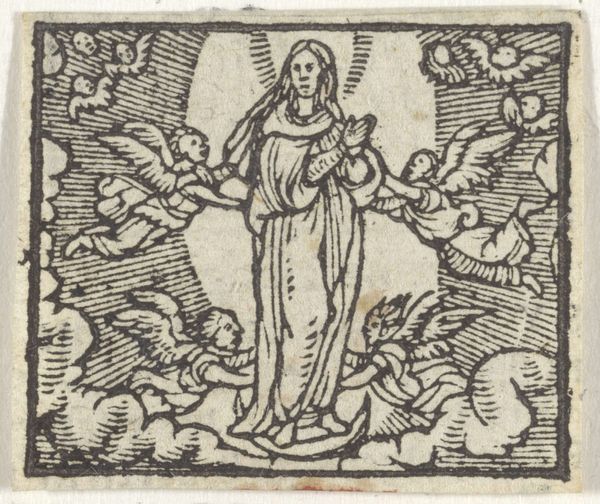 Editor: Here we have a print from around 1470-1480, titled "Madonna and Child in a Glory Standing on a Crescent Moon," by an anonymous artist. It's a woodcut, an early printmaking technique. The image has a compelling, austere beauty, with the simple lines and blocks of color. What strikes you most about the composition? Curator: Immediately, the tension between the linear structure and the iconic figures captures my attention. Notice the flattened perspective, typical of the period, which emphasizes the symbolic rather than the representational. The radiating lines surrounding Madonna serve as a halo, but formally they act as dynamic vectors leading the eye around the composition. What role does color play, do you think? Editor: I see how the limited palette—mostly reddish pink, green and yellow – seems intentional. It highlights the essential forms and doesn’t distract from the lines. It's almost as if the color is applied for structural reinforcement rather than realistic depiction. Curator: Precisely. The intaglio technique— the incised lines holding the ink – becomes a critical element. Consider the stark contrast created. How does this interplay of light and shadow affect the overall mood? Is there any element that, in your view, dominates the formal relationships within the work? Editor: The contrast adds to the reverential feeling but also makes the figures feel monumental despite the print’s small size. The radiating sun feels quite prominent, almost overshadowing the figures even while accentuating them with light. Curator: An astute observation. The artist deftly navigates between devotional imagery and formal concerns. Looking closely allows us to appreciate how line, color and composition elevate a simple religious subject to a sophisticated visual statement. Editor: Absolutely, examining the artistic elements highlights the power this print holds, despite its age and relative simplicity. Thanks for pointing that out!