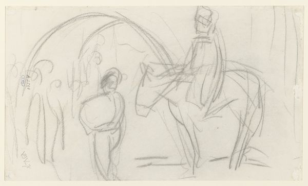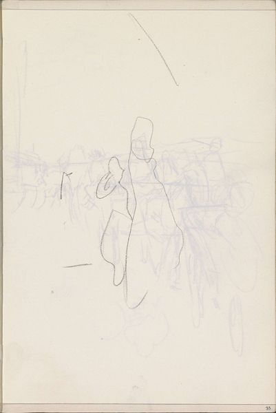 Curator: Isaac Israels sketched this work, “Woman with her Hands on the Ground,” around the 1920s. It resides here at the Rijksmuseum, a pencil drawing on paper. My first thought is its almost painful incompleteness, yet something powerful still comes through. What strikes you? Editor: Its delicacy, really. Those almost ethereal pencil lines suggesting figures emerging from… well, the void of the page. There's a kinetic energy even in its unfinished state, an attempt to capture fleeting moments of these figures’ states of mind or bodies in time. Curator: Indeed. There's an intentional ambiguity. Her posture is significant. She’s hunched, but not necessarily defeated. What do you feel her hands planted on the ground communicates? Editor: I wonder if she’s bracing herself? Rooting perhaps. Or it may speak to some profound act of connection, drawing power from the earth. It has connections to art from that time but could even evoke ideas of a mother goddess in some contexts. What are your thoughts on these ethereal women as representative of societal and cultural trends for women at the time? Curator: Perhaps they are the spirit of the flapper, trying to anchor themselves amidst societal change after the first world war. They represent the emergence of the "new woman," unbound from conventional expectations yet in flux in the post-war landscape. Notice also how her face is partially obscured, perhaps hinting at the multifaceted identity these women were developing. The formal sketch might hide this face but speaks to something more complex. What is being said through their form? Editor: Yes, that very incompleteness might ironically become its strength! It captures not just a physical likeness but a cultural state of constant negotiation. The light pencil strokes, too, mimic that—evanescent yet bold, a balance the "new woman" herself was trying to achieve. This artwork may be subtle, but the sketched forms hint at deeper conversations of identity and belonging from the early 20th century. Curator: An evocative interpretation; I will leave it here. It's often in such delicate expressions that a culture reveals itself most sincerely. Editor: Absolutely, finding unexpected insight in such seemingly unfinished work; that, too, is its allure.