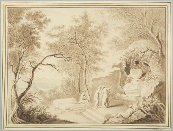 Editor: Here we have Thomas Gainsborough's "Landscape with Cottage alongside a Road," a small drawing rendered with chalk and graphite. The cottage seems almost engulfed by the surrounding nature. What can we make of this piece? Curator: It is interesting to look at Gainsborough's process here. Note the visible layering of chalk and graphite – inexpensive, readily available materials. Was this a preparatory sketch, or a finished work intended for a different, perhaps less elite, market? Editor: So, you're suggesting the *making* of the artwork challenges assumptions about its artistic value? Curator: Precisely! The materials and the apparent speed of execution invite us to consider the social and economic context of artistic production in 18th-century England, and how art serves different levels of society. Editor: I never considered how the materials themselves played such a significant role! Thanks for pointing that out. Curator: My pleasure! Looking closely at the process and materials can open up new avenues for understanding any artwork.