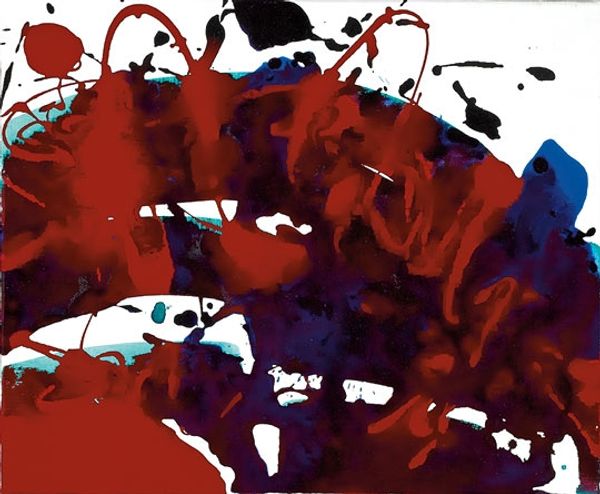 Editor: This is an untitled work by Sam Francis, created in 1994 using acrylic paint. What strikes me is the energy, a chaotic burst contained within this stark white background. What do you see in this piece? Curator: I see an engagement with the legacies of Abstract Expressionism, but also a conscious re-evaluation. Think about the social climate of the early 90s – the rise of identity politics, debates around multiculturalism. Francis, working within a traditionally white, male-dominated field, is almost exploding the canon. The splatters disrupt any sense of order, a visual representation of challenging power structures. Does the contrast between the dark circle and the vibrancy around it spark any thoughts? Editor: I guess, it seems like the dark circle almost absorbs the chaos. Is that maybe a symbol of the established order trying to contain these new forces? Curator: Exactly. Or perhaps it’s about centering a specific experience, allowing it space and definition within the broader landscape of social change. Francis isn't just making pretty paintings; he's engaging in a visual dialogue about who gets to take up space and how. Considering how our understanding of "center" has evolved, and who gets to be there is vital. Editor: That makes me see it very differently. I was just focusing on the aesthetic qualities. Curator: And those are important, but understanding the socio-political currents influencing the artist helps us move beyond surface readings. It prompts us to consider not just what we see, but what it *means* to see it in a particular time and place. What are your final thoughts now? Editor: It's fascinating how the painting speaks to broader social issues, even if abstract. I am going to read about Abstract Expressionism again to challenge my perspectives. Curator: And, hopefully, to find new entry points for your own engagement with contemporary art and social justice!