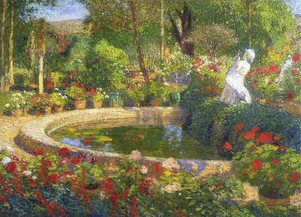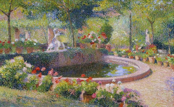 Editor: This is Henri Martin's "Fountain in My Garden," painted in 1904, using oil on canvas, clearly en plein air. It's such a calming, peaceful scene... I'm really drawn to the dappled light on the water. What do you see in this piece? Curator: Beyond the pleasing Impressionistic aesthetic, I find it fascinating to consider the *making* of this garden. Who maintained it? The painting valorizes leisure, but leisure enabled by the labor of others. We see the final product – a beautiful garden, artfully rendered in oil – but where is the evidence of the work necessary for its existence? Editor: That’s a very different way to look at it! I was just appreciating the scene and the artistic technique. Curator: Exactly. Consider the terracotta pots, for example. These aren't merely decorative; they are products of industrial processes, made to be sold, to facilitate leisure in a garden. Furthermore, the very availability of paint in tubes… these material conditions allow Martin to depict this scene *en plein air*. It all contributes to the ease of portraying this idealized vision. Editor: So, you’re saying the painting itself, and the garden it represents, are both products of specific social and material conditions? Curator: Precisely. The materials – the oil paint, the canvas, the very idea of easel painting outdoors – are all inextricably linked to broader systems of production and consumption in the early 20th century. Even the framing becomes important: What is included, what is excluded, and how the artist’s labor shapes the final narrative. Editor: That makes me rethink how I see not just this painting, but the whole Impressionist movement! Curator: It challenges us to look beyond surface appearances and examine the complex material and social networks that underpin artistic creation. Editor: It's a much less romantic and far more engaged reading than I expected. I really appreciate this deeper look.