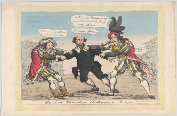 This print titled "The Honeymoon" is a political cartoon that presents a potent blend of classical imagery and English political commentary. Here we see Britannia, a symbol of Great Britain since Roman times, clad in classical armor and flowing robes, dancing with John Bull, the corpulent personification of England. Britannia's helmet and spear hark back to Athena, goddess of wisdom and warfare, embodying strength. John Bull's jovial demeanor suggests renewed prosperity, reflecting the optimism following political changes. Notably, the visual language used here—allegorical figures representing nations—echoes in various epochs. Compare Britannia to Marianne in French art; both personify national identity. The enduring appeal of these symbols highlights our collective need to embody abstract political ideas in relatable human forms. Britannia's modern usage reflects the cyclical recurrence of symbols, their meanings shifting yet retaining a powerful subconscious resonance.