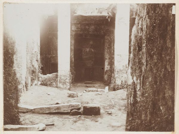 Curator: What a haunting photograph. This is Félix Teynard’s "Béni-Haçan, Architecture Hypogéene - Tombeau de Névothph," taken between 1851 and 1852. It captures the rock-cut tomb in Middle Egypt. Editor: It certainly has a stark, austere quality. The tonal range is quite narrow, emphasizing the rough textures and the geometric simplicity of the columns and lintels. I notice the composition is rigidly symmetrical. Curator: Yes, the geometry reflects the profound symbolic order that permeates ancient Egyptian beliefs about death and the afterlife. Tombs weren't merely final resting places but powerful portals and declarations of eternity. The columns themselves, though seemingly simple, echo earlier plant-based supports – referencing the life that bursts forth from the earth, a metaphor for resurrection. Editor: Interesting. I was struck more by the negative space. The darkness of the tomb entrances creates a void, a strong contrast with the solidity of the stone architecture. It introduces an almost palpable sense of mystery. Look at how those voids mirror each other. Curator: That visual balance serves a deeper purpose. Egyptian art, especially funerary art, constantly seeks equilibrium – the unification of opposites. Life and death, order and chaos. That carved façade represents not just physical space but also the psychological space of transition. It makes me consider the relationship between memory and mortality within ancient Egyptian society. Editor: I appreciate that. For me, though, the rough-hewn surfaces and imperfect symmetry enhance its aesthetic appeal. There's a beautiful tension between the formal architectural structure and the erosion and defacement marked on those walls. Those irregular textures and defacements break what would otherwise be very mechanical visual elements. Curator: Indeed. These imperfections whisper a history of both time and cultural interaction, a palimpsest where ancient beliefs have mingled with modern realities. Editor: Exactly! And to bring it full circle, the artistry resides in its successful translation into this starkly beautiful image! Curator: The past brought into our present, beautifully. Editor: An architectural wonder made present to us via an eye toward form.