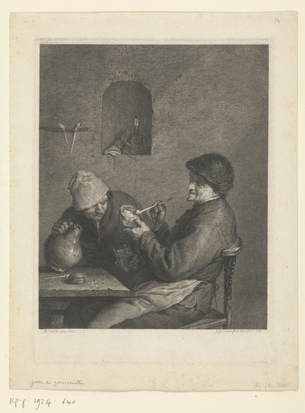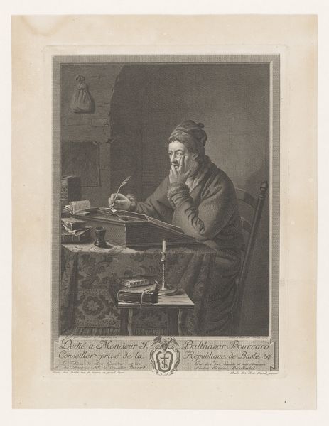 Editor: This is "Schoenmaker," dating roughly from 1754 to 1809, currently held in the Rijksmuseum. The artist is François Hubert. It's a monochromatic print. It feels incredibly intimate. The subject, a shoemaker, seems caught in a moment of quiet concentration. What do you see in this piece? Curator: Beyond the surface, this image resonates deeply with embedded cultural narratives. The shoemaker, an artisan, occupies a unique position. Shoes themselves, think of Cinderella's slipper, have carried symbolic weight. What do shoes mean to you? Editor: Status, perhaps? Or a journey? They protect us. Curator: Exactly. They symbolize both social standing and our individual paths through life. This shoemaker isn't just crafting footwear, he's participating in the narratives we weave around ourselves. The very act of creation is infused with power; shaping materials echoes our own attempts to shape our destinies. Notice the birdcage too: domesticity and restriction combined. Does the shoemaker liberate, or constrain? Editor: I never thought about it that way. It is like the objects he's creating carry hidden stories. So, seeing the shoemaker now, it isn’t just about the craft, but a connection to these deeper ideas through symbolism. Curator: Precisely! By understanding these images, we come to understand their enduring influence on our imagination. Editor: That’s a fresh outlook on the piece, it’s so insightful. Curator: My pleasure! It shows us the weight even a daily image carries!