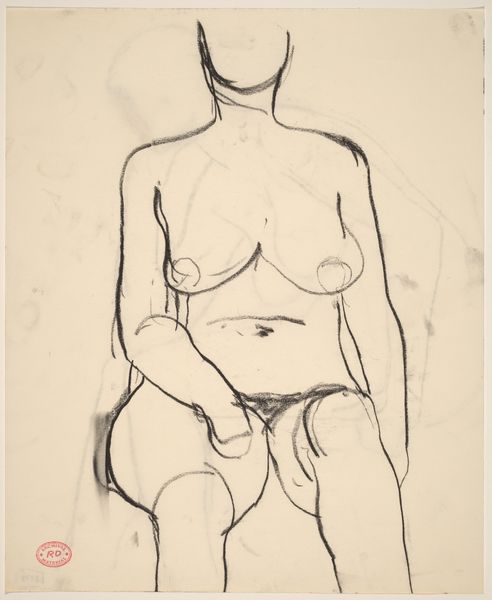 Editor: So, we're looking at Richard Diebenkorn's "Untitled [seated female nude with raised right arm]" made between 1955 and 1967, created with ink. It's interesting how simplified the form is, almost gestural. What catches your eye in this drawing? Curator: You know, it’s that rawness that gets me. It’s like catching a glimpse of the artist's process, his searching, his doubts even. Diebenkorn wasn't just trying to copy what he saw. He was after something deeper – the feeling of the pose, the weight of the body. What do you think it communicates? Editor: Maybe vulnerability? It feels like an intimate moment, caught on paper. Curator: Absolutely! It is intimate. You sense that hesitancy in the lines. He doesn’t hide those little imperfections, the places where he reworked things. It's so different from, say, a polished academic nude, where everything's idealized. Diebenkorn offers you reality, still full of beauty though. See the expressiveness achieved by what’s been left out versus what’s included. Where does your eye linger? Editor: Probably the face, and then how he rendered the hands. They feel so deliberate, even with their abstraction. Curator: The hands have a weight about them, don't they? A solid groundedness at the lower center of the drawing, acting as visual anchors for everything above them. It also suggests the weight of existence or experience. It brings this raw reality to it. It almost feels defiant. And then he surrounds that strong image with what looks almost to be pale ghosts, the vestiges of prior renderings… Editor: This makes me think about how even in something unfinished, there's so much intention, or perhaps so much more feeling. Curator: Exactly. Maybe it’s about finding beauty in the imperfect. We expect art to always be complete, neat… but maybe there is much more beauty in this revealing quality and process of showing its creation?