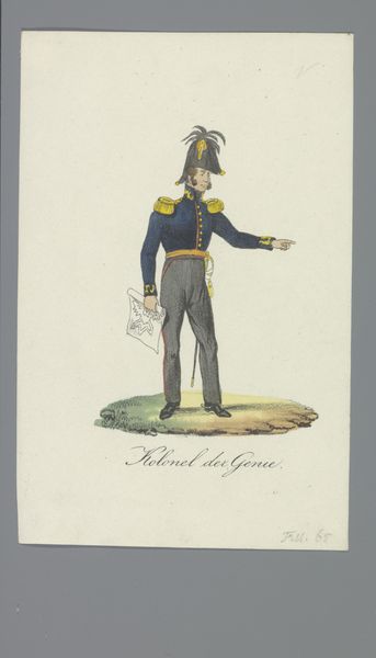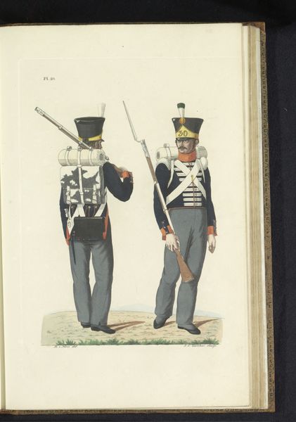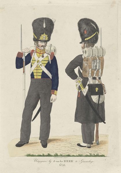 Curator: This vibrant piece by Antoni Zürcher, crafted in 1823, depicts two soldiers, titled “Flankeur en Fuselier van het Regiment Zwitsers no. 29." Editor: My first impression is the meticulous detail in rendering their uniforms. It speaks volumes about societal pride vested in martial display, doesn't it? Curator: Precisely. Zürcher was a master of capturing not just likeness but also the precise details of rank and regalia. It is a watercolor drawing on paper, housed here at the Rijksmuseum. Editor: Looking at it now, beyond the artistry, I'm drawn to the actual labor involved in equipping a soldier then. The layers of uniform, the heft of the rifle... what kind of conditions shaped such elaborate gear? Curator: Good question! Consider the social context – these men are part of a Swiss regiment. Switzerland at this time was essentially renting out its soldiers as mercenaries. Their bodies and skills were commodities, quite literally manufactured for war. Editor: It’s fascinating how Romanticism embraced themes of nationalism while also reflecting the individual within these systems. Look at their faces – a touch of idealism, maybe, but also a sense of duty, a cog in this machine you describe. How are the watercolors laid down, any visible under drawing? Curator: Indeed. The composition reinforces this: one facing forward, engaged, the other turned away, perhaps contemplative, yet bound to the same fate. If you inspect closely, there is a sense of control, thin layers with little impasto; the drawing is well defined by linear markings. Editor: So, beyond national pride, is this watercolor maybe gesturing at some anxiety, too? These men become these anonymous, yet individually crafted, figures representing something so much bigger. Curator: Possibly. It offers a chance to reflect not only on a specific regiment but the role of individual labor and lives intertwined within broader political and economic machinations. A watercolor on paper offering a wealth of narratives. Editor: I think so. In seeing them presented with such directness we appreciate how complex even seemingly simple art may represent the larger material world.