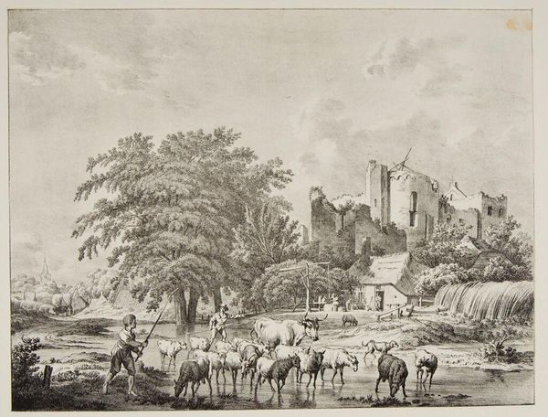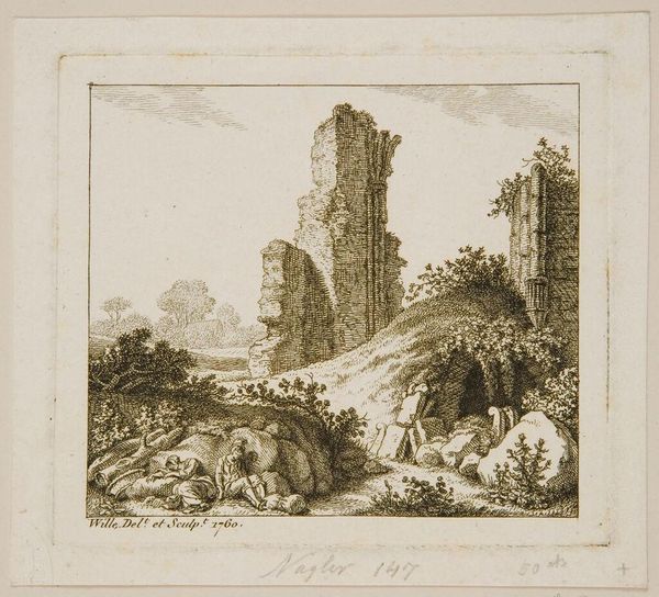 Curator: Mechau’s etching, "Avanzi dell'aqua Marzia, Claudia, e dell'Aniene vecchio," presents us with the ruins of ancient aqueducts. What strikes you immediately about this image? Editor: A haunting stillness. The crumbling aqueducts loom, yet the figures in the foreground seem almost oblivious, caught in their own quiet dramas. Curator: Indeed, the contrast is quite stark. Notice how the linear precision and controlled tonality establish a clear spatial hierarchy and evoke a sense of melancholic grandeur. Editor: Absolutely. It is like the memory of an empire, etched in light and shadow. The aqueducts, once vital arteries, are now just skeletal remains. It gives you pause, doesn’t it? Curator: Precisely. Mechau invites us to contemplate time, decay, and the enduring power of structural form. Editor: Yes, a potent reminder of our own ephemeral existence against the backdrop of history's silent witnesses.