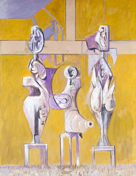 Editor: I find myself immediately drawn to the stark linearity of the cross against that muted, unsettling blue. Curator: That striking visual, rendered by Graham Sutherland, is simply titled "Crucifixion." Sutherland, born in 1903, grappled with depicting profound suffering amidst the backdrop of war and societal upheaval. Editor: The near-monochromatic palette accentuates the angularity and skeletal form, stripping away any sentimentality. It’s a brutal geometry. Curator: Absolutely. Considering post-war anxieties and the re-evaluation of faith, Sutherland presents us with a body that embodies societal anguish, reflecting a crisis of meaning. Editor: The way light and shadow define form speaks to the artist's formal mastery. It's a starkly modernist interpretation. Curator: Indeed. It’s fascinating how Sutherland layers personal and collective trauma within this iconic image. Editor: It’s an impressive composition, prompting contemplation on form and substance. Curator: Agreed; "Crucifixion" prompts us to confront pain, identity, and historical context.