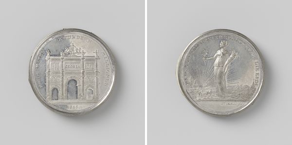 This small silver medal, crafted by Johann Thomas Stettner, presents two distinct yet interconnected visual fields. The first features a classically draped figure set against radiating lines, while the second depicts an elaborate archway. These elements, carefully arranged, invite a deeper exploration of their symbolic resonance. The medal's design orchestrates a dialogue between victory and its representation. On one side, the allegorical figure seems to bless the earth. This can be interpreted using semiotics as a sign of peace and prosperity following conflict. The opposing image of the archway—a triumphal structure—functions as a cultural symbol of military achievement and imperial power. Note the inscription "Gloria" above the arch, reinforcing themes of fame and recognition. This medal is not merely a commemorative object; it's a condensed narrative about power, victory, and their enduring representation in art and culture. As such, it prompts a reconsideration of how societies construct and celebrate their triumphs, a process that continues to evolve.