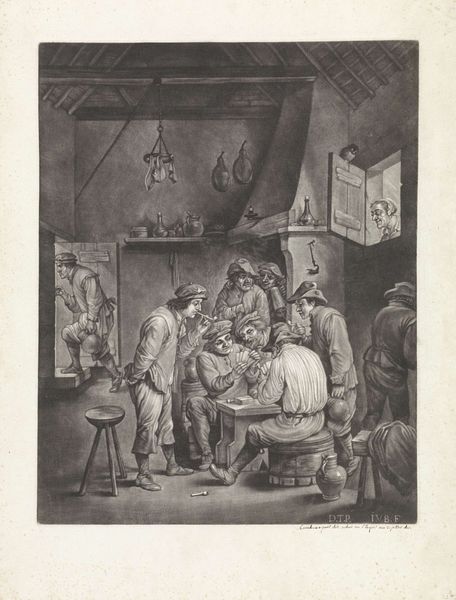 Editor: So, this is "Peder Ruus d\u00f8mmes til at v\u00e6re soldat," or "Peder Ruus Sentenced to be a Soldier," an engraving by J.F. Clemens from around 1770. The scene feels chaotic, a tavern perhaps, with one figure brandishing a sword. What symbols or stories do you think are unfolding here? Curator: The sword, first and foremost, represents power and authority, of course, but also potential disruption. What kind of disruption is what we must ask. Observe how the wielder of the sword isn't integrated within the intimate group gathered at the table. He stands apart, a visual and psychological outsider, but who holds authority. Does this signal the intrusion of outside forces into the lives of ordinary people? Editor: It seems that way. The men at the table look distraught and conflicted. Curator: Exactly. Note how their postures communicate defeat or fear, while the man seated, with what appears to be a turban, stares directly at the swordsman, attempting engagement. Are those coins on the table? This entire setting suggests a societal disruption due to the whims of war or power; are these the wages of the men who are sent off? The coin perhaps denotes that some sort of game or bartering took place to reach this stage. What happens when external systems – the army, the state – impose themselves on everyday life? This tension carries great cultural weight. Editor: So the scene carries a powerful message about individual freedom versus societal obligation? Curator: Precisely. Clemens is prompting us to question the costs of societal power. Think of the cultural memory, the history, tied up in a single image of a sword disrupting a tavern scene. Editor: It’s amazing how much depth there is in what seemed like a simple scene at first glance. Thanks, this gives me so much to think about. Curator: Indeed, every image echoes countless others across history. We should always look for those connections.