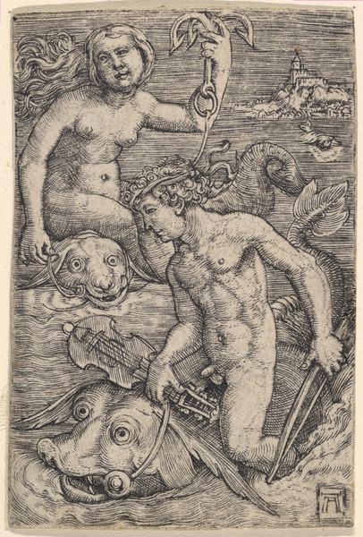Albrecht Altdorfer made this intricate metalcut, titled 'Arion and a Nereid,' sometime in the early 16th century. During the Renaissance, classical myths were often reimagined through the lens of contemporary values and aesthetics. Here, we see Arion, a musician from ancient Greece, famed for his enchanting music. In the original myth, Arion is rescued by a dolphin. This version includes a Nereid, a sea nymph from Greek mythology. She holds an anchor, symbolizing safety and rescue at sea. She embodies the feminine divine, adding layers of complexity to the narrative. Altdorfer's personal experiences and beliefs are subtly woven into the scene. The choice to depict the figures nude is a reflection of Renaissance ideals, and the artist's decision to include the Nereid might speak to his own understanding of classical stories. It is a harmonious blend of classical mythology and Renaissance interpretation.