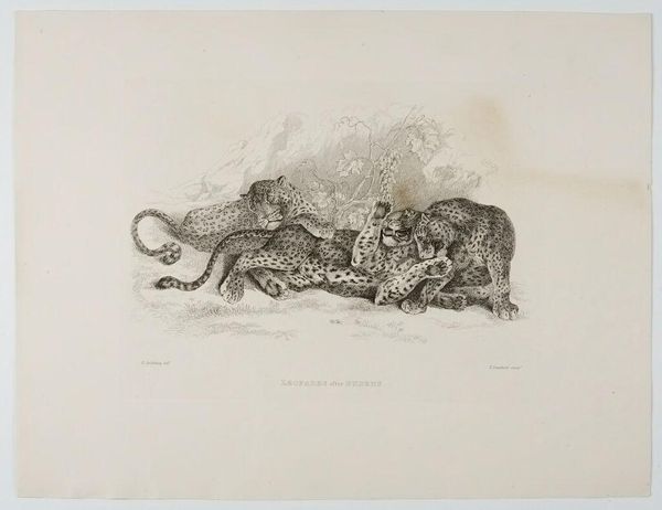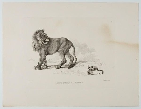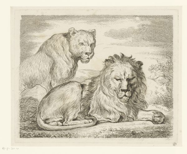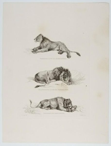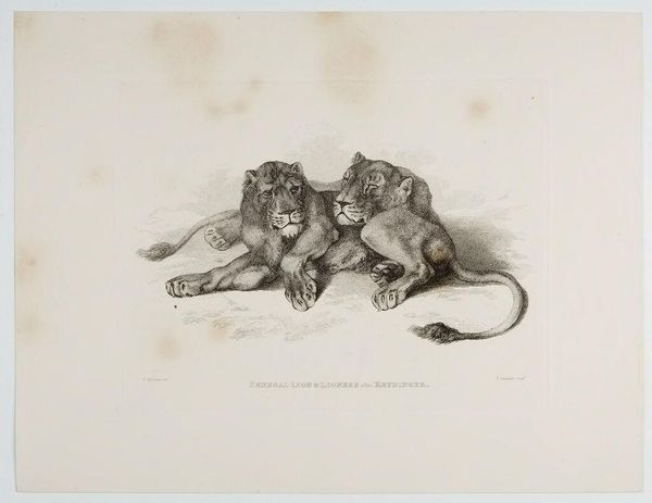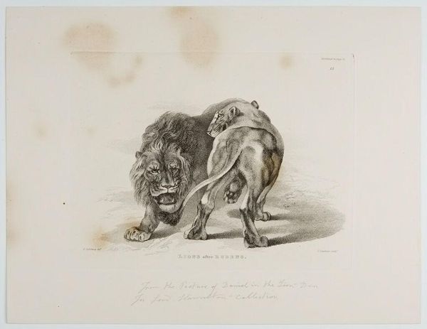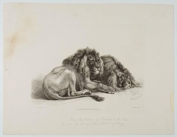 Curator: This is "Lions after Rubens," an engraving by Thomas Landseer, dating back to the 19th century. Editor: Right away, I get a sense of simmering tension. The lion in the front stares right at you, while behind him, another is snarling. It's like a powder keg about to blow. Curator: Landseer was known for his animal engravings, often drawing upon the works of famous painters like Rubens, here engaging with ideas of the sublime and the power of nature. Editor: It's interesting how he captures the texture of their fur with such fine lines. I can almost feel the roughness of their manes. Did prints like this make art more accessible to the public? Curator: Absolutely. Engravings played a vital role in disseminating images and ideas to a broader audience. This print would allow those who couldn't see a Rubens in person to still experience it. Editor: It makes you think about who got to see art back then, and how prints democratized that experience, even if it was just a glimpse of lions through someone else’s eyes. Curator: Precisely, and it showcases the importance of reproductive prints in shaping art history and public perception. Editor: Well, it’s certainly given me a new perspective on both Landseer and the role of art in society.