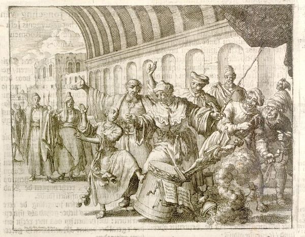 Cornelis van Kittensteyn created this print, "Edellieden rond een rijk gedekte tafel," using etching techniques. The monochromatic composition, filled with intricately rendered figures and objects, conveys a sense of lively disorder and invites a curious gaze. The scene features a group of well-dressed individuals gathered around a table, drinking and smoking. The arrangement of the figures, some standing, some sitting, and some even mid-gesture, breaks the conventional still life format and suggests a dynamic, fleeting moment. The detailed rendering of their clothing, facial expressions, and the objects on the table enriches the overall texture of the image. Van Kittensteyn's choice of etching as a medium allows for fine lines and a remarkable level of detail. The cross-hatching and tonal variations create depth and volume, drawing the viewer's eye across the scene, from the gesturing figures to the complex arrangement of objects on the table. This composition is more than just a depiction of a social gathering; it is a carefully constructed representation of human interaction and material culture, captured with formal precision.