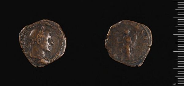 Curator: This is a sestertius of Alexander Severus, a Roman coin held in the Harvard Art Museums collection. Editor: Immediately, I'm struck by how time has softened the details. The patina creates a subdued, almost melancholic mood. Curator: Indeed, the wear speaks volumes. Coins like this were not just currency, but also powerful symbols of imperial authority. Severus's portrait would have been instantly recognizable. Editor: And what of the figure on the reverse? I note the deep relief, the way the light catches its contours, despite the corrosion. Curator: That's likely a depiction of a Roman deity, perhaps Pax, the goddess of peace. The coin's imagery would have aimed to project stability and divine favor. Editor: The choice of bronze, too, is interesting. Less ostentatious than gold or silver, it speaks to a wider circulation, a democratization of the imperial image. Curator: Precisely. It's a fascinating artifact, offering a glimpse into Roman power structures and their visual language. Editor: A small object, yet containing echoes of an empire. I find that powerfully evocative.
