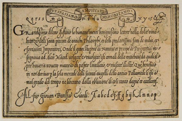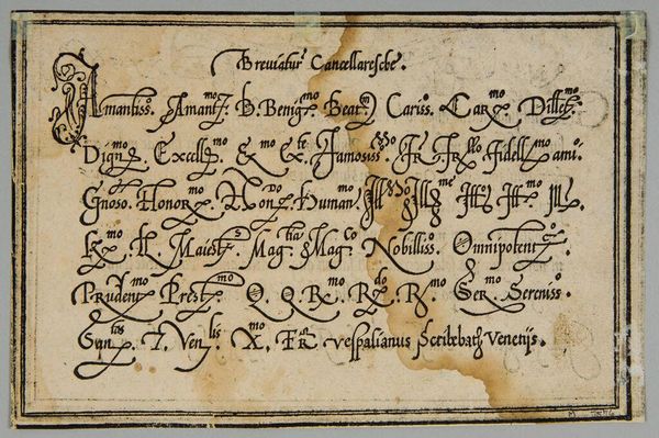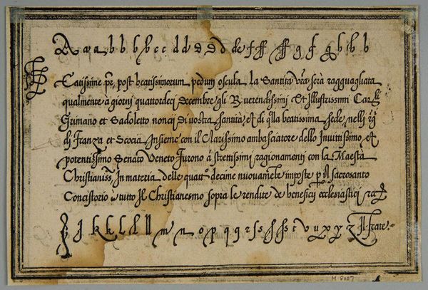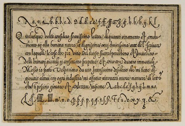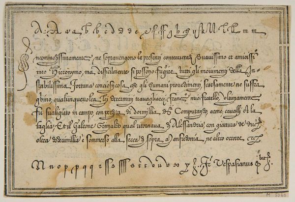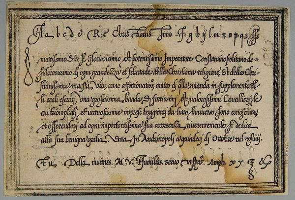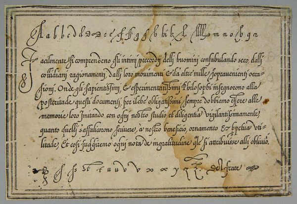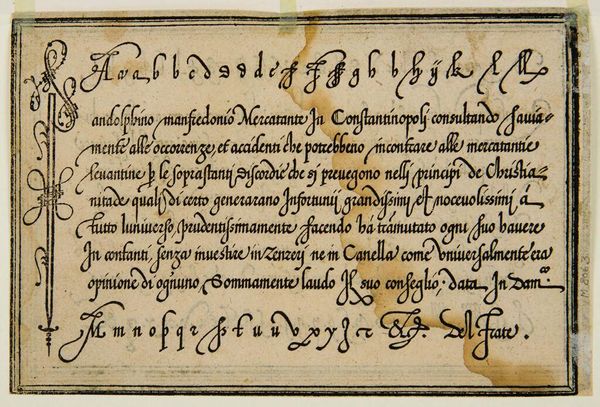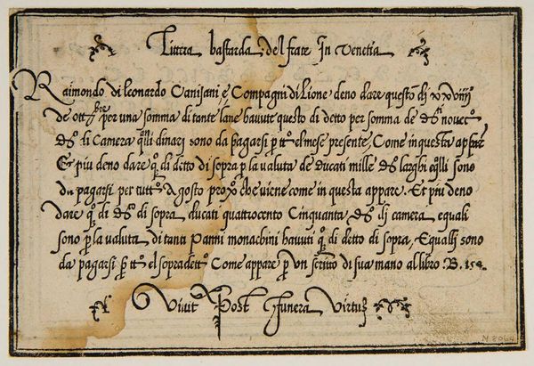 Curator: This is "Leave III," an anonymous work held here at the Harvard Art Museums. Editor: It feels like a whispered secret, doesn't it? Intimate. Maybe a little stained with time... like a forgotten recipe tucked away in a well-loved cookbook. Curator: The script, in Italian, details a transaction—olive oil, specifically. Look at the elegant flourishes. Each stroke carries a certain weight, a formal yet personal touch. Editor: Oil, eh? That explains the stains! I can almost smell the Tuscan countryside. Imagine the stories this document could tell, not just of trade but of meals shared, lives lived... Curator: Precisely! It connects us to a specific time and place, a tangible link to everyday life centuries ago. Editor: I love how something so seemingly mundane can spark such vivid images. It's a reminder that history isn't just dates and battles—it's also olive oil and elegant handwriting.