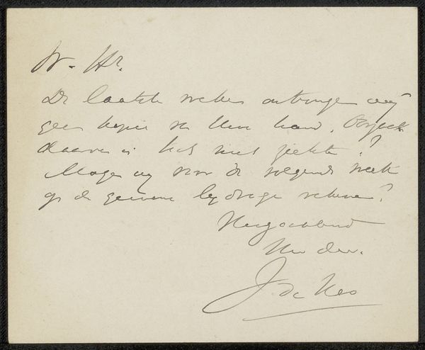 Editor: Here we have Jozef Israëls’s "Briefkaart aan Philip Zilcken," a postcard created before 1898, employing ink on paper. There's a sense of intimacy looking at this; it’s clearly a personal note. The handwriting itself becomes a portrait of the artist. What's particularly interesting to you about this piece? Curator: It's fascinating to consider how something as quotidian as a postcard functions as a historical artifact. The handwritten note reveals the social networks of the artist; in this case, correspondence between Israëls and Philip Zilcken. Think about the role Zilcken played – a contemporary artist, critic, and editor of a Dutch art journal. How might that influence Israëls’ choice to communicate through this medium, carefully crafted yet casual? Editor: So, the postcard isn't just a quick note; it's a carefully considered form of communication within the art world itself? Curator: Precisely. This is the public role of what might seem like private communication. Consider, too, how this postcard might have been collected and preserved. It speaks volumes about the evolving appreciation and institutionalization of the artist's legacy, and perhaps the romantic appeal of his era as expressed through his artwork. How do you view the way museums present seemingly ephemeral materials like letters? Editor: That’s a good question! It definitely shifts my understanding of this piece. It's less about the content of the message, and more about the historical context of art and the artist and the role they play within their network. It also prompts me to be more mindful of seemingly “insignificant” artworks. Curator: Exactly! By analyzing the social fabric surrounding Israëls' work, and recognizing the politics inherent in preserving such items, we get a richer understanding of not only Israëls himself, but of the era in which his artworks were so beloved. Editor: This really changed how I will view written correspondence within artwork displays going forward! Thanks.