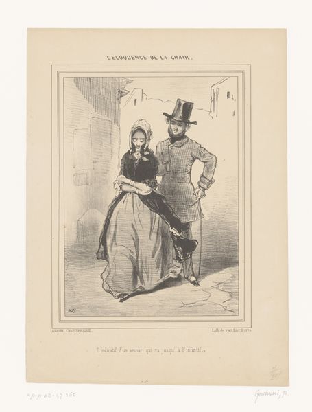 Curator: This delightful engraving is by J.J. Grandville, created in 1843, and wryly titled "...Happy to get away with it so cheaply." It's currently part of the Metropolitan Museum of Art's collection. What springs to mind for you upon viewing it? Editor: Immediately, the sense of chaotic energy jumps out. The figure's awkward, almost panicked posture, the shattered cage...it reads like a physical comedy routine frozen in time. And of course the monochrome of it. What can you tell me about it? Curator: Grandville was a master of visual storytelling through these types of prints. The "Little Miseries of Human Life" series satirized everyday social mishaps. Looking at the engraving closely, observe how the broken cage unleashes what appears to be coins all over the floor as a man falls from a partially damaged doorway or possibly window, struggling and out of balance as he exits hastily from the doorway to a room behind, where a woman appears stunned to see him scrambling into the visible space of the frame, and raising his hat above him in a state of hurried anxiety. Consider it: genre-painting using prints! Editor: The exaggerated proportions, the almost cartoonish rendering of the figures – it really emphasizes the farcical nature of the scene. You can almost hear the clatter and see the sweat beading on his brow! Also notice, this engraving utilizes distinct visual cues of its period such as formal dress of men, dresses worn by the women and home accessories popular at the time. How was this received when it was released? Curator: It was hugely popular, of course! Grandville's ability to pinpoint the humorous embarrassments within the societal codes struck a chord. Think of the rapidly growing urban audiences, hungry for reflections—however satirical—of their own lives and perhaps this artist offered a very visible cultural production that may be seen to either reinforce class differences or lampoon them. Also, consider the potential meanings attached to the shattering of cages at a moment of societal transition. Editor: Fascinating! I'm drawn to the clean lines of the engraving itself – the detail is remarkable given the medium and size. It almost feels like a precursor to modern comic strips with its direct and simple message. Curator: Exactly. Grandville used formal constraints of line and tone for effective commentary on complex societal events. Its narrative is surprisingly advanced. Editor: I see it. The work resonates today because it deals with the timeless themes of misfortune and, ultimately, humor—delivered through impressive visual encoding. Curator: Well said. Grandville gives us much to think about through this visually engaging work.