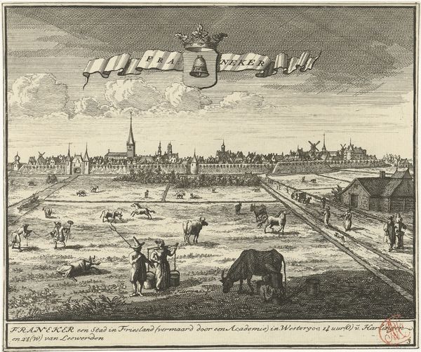 Jacob Folkema created this print called 'View of Workum', using etching and engraving during the height of the Dutch Golden Age, a time when the Netherlands was a global leader in trade, science, and art. At first glance, it's a pastoral scene, yet it's so much more. The detailed depiction of the landscape, with farmers harvesting crops, situates the working class, and the land itself, as central to the prosperity of the Netherlands. Look closer, though, and you will notice that Folkema’s artistic choices weren’t just about documentation, but about constructing a particular image of Dutch identity. This image promotes the idea of a well-ordered society, where labor and land are harmoniously connected. In this context, the presence of laborers in the fields is not merely incidental but a statement about the value of hard work and the Dutch connection to the land. There’s a story being told here about who belongs and who is invested in the nation’s success. How does this idealized image of labor and identity resonate with the complex realities of the time?