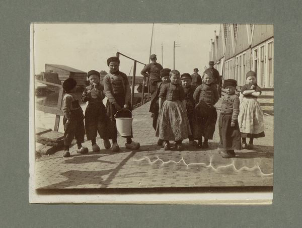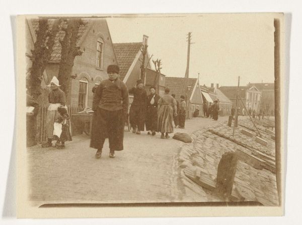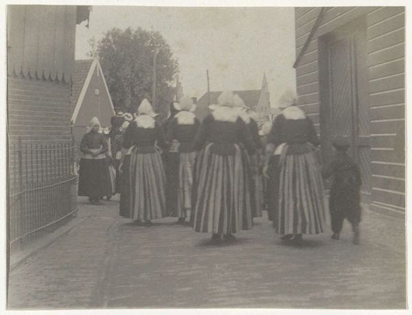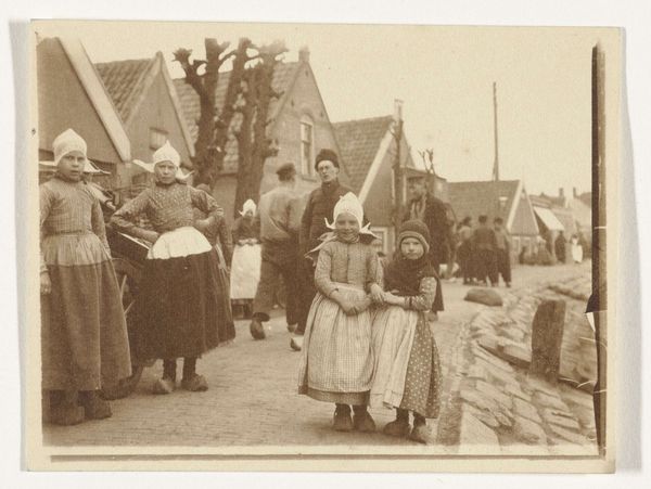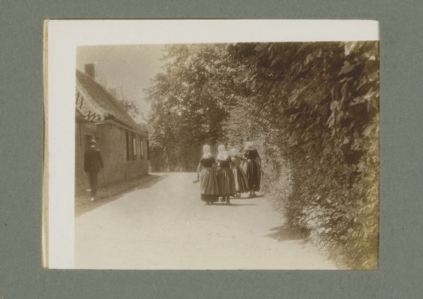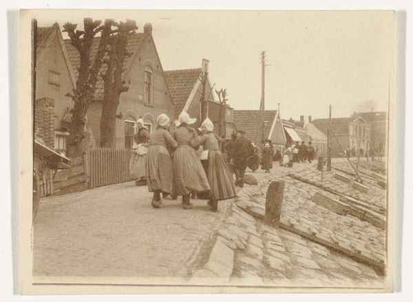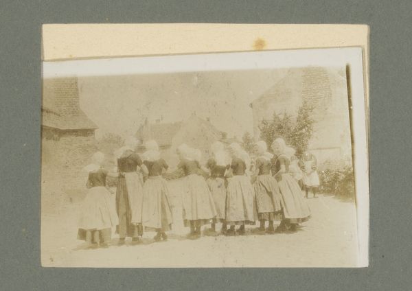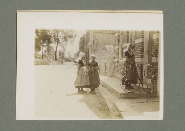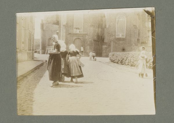 This photograph, 'Meisjes in klederdracht op straat' by G. Hidderley, captures a moment that feels both distant and familiar, using the simple tools of light and shadow. It's a reminder that art is often about seeing the world, not just recording it. The sepia tones lend it a timeless quality, but it's the texture that really grabs me. Look at the way the light catches the folds of their skirts, the rough surface of the cobbled street, and the soft edges of the buildings in the background. There's a sense of depth created by the subtle variations in tone, a kind of atmospheric perspective. It's like Hidderley wasn't just taking a picture, but building a world, layer by layer. The soft focus reminds me of the Impressionists, like Monet, who were interested in capturing the fleeting effects of light and atmosphere. But where Monet used color, Hidderley relies on the subtleties of tone to create a sense of mood and atmosphere. It's a reminder that art is an ongoing conversation across time and space.