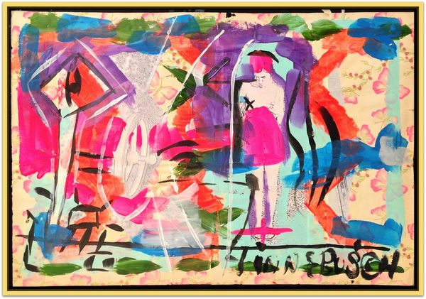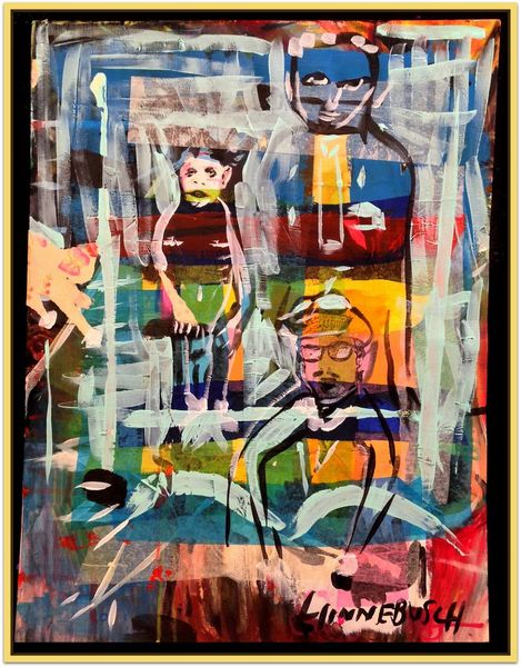 David Michael Hinnebusch created this painting titled "Time Queen" using vibrant acrylics and dynamic brushwork. The composition pulses with energy as strokes of lush greens, radiant yellows, and deep blues converge across the canvas. Note how Hinnebusch uses color to create a sense of depth and movement. The painting invites us to interpret its subject—a figure seemingly suspended within a whirlwind of time. Her facial expression, rendered in delicate blues and whites, conveys both serenity and pensiveness, set against a backdrop of gestural abstraction. This contrast prompts a fascinating visual tension. The loose, expressive quality of the brushstrokes destabilizes any fixed reading. In essence, the painting operates within a system of signs and symbols that are fluid and open to interpretation. It allows for personal reflection on time, existence, and the roles we inhabit.
