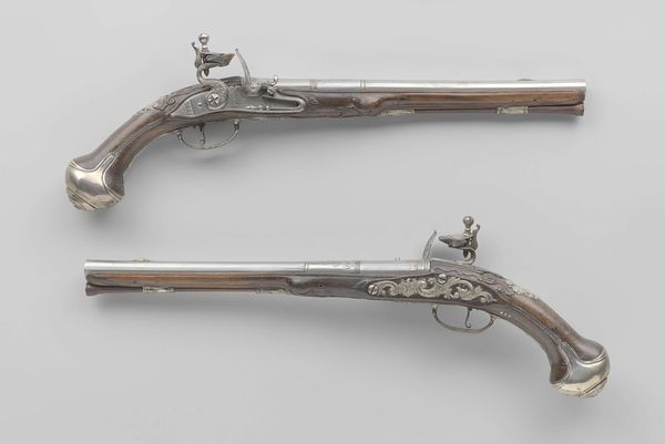 Curator: Alright, let's dive into this remarkable object here at the Rijksmuseum. This is a Percussion Pistol, dating from approximately 1830 to 1870. It's crafted with a combination of wood and metal and believed to be the work of Georg Pistor. What strikes you immediately about it? Editor: Immediately, it gives off a sense of Victorian seriousness. I imagine stern-faced men in dimly lit parlors. It feels quite somber, almost...melancholy, even though it is such an exquisite killing machine. Curator: Precisely. While lethal, it's an object of craftsmanship. Note the detail of the metalwork; it shows considerable skill. These weapons weren’t merely tools; they were statements of status and power, intricately tied to the social hierarchies of the era. Editor: And the wood grain! See how that reflects the light? Almost as though you could see into the trees' past. I am so drawn into these tactile elements - you forget the potential violence because it's so inviting and...smooth! Curator: That tactile invitation would have served its purpose. Ownership was often displayed as evidence of prestige; these weren't always about immediate aggression. These would be hunting pieces primarily, as they have rather limited scope as weapons of war at that period. It has moved to be primarily a symbol of gentry or power. Editor: You’re right. There’s an artistry to the curves and ornamentation. Makes me wonder about the lives it touched, not just as a weapon, but perhaps as a treasured object passed down through generations. Sort of like the ancestral watch with extra deadly consequences! Curator: It encapsulates much of what interests historians, you see. It shows how artistry and function are intertwined, but even how the same object occupies several roles in social hierarchy and function. Editor: Looking at it again, it evokes an age of formality and duels at dawn – an almost theatrical world. Though the darkness hints to its existence. I think I prefer the dreams it conjures compared to its real functionality. Curator: Perhaps it’s because its very function – lethal power – seems incongruous with the effort placed into its artistic appearance. These nuances make for compelling questions about art's place in our society. Editor: I quite agree, and that tension is precisely what captures the imagination so vividly even after centuries. Thanks for the walk, my learned friend.