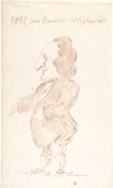 Pier Leone Ghezzi made this caricature of The Duke of Capodichino using pen and brown ink, with brown wash on off-white laid paper. It's not painting or sculpture, but graphic art, a quick, deft process, like reportage. Notice how Ghezzi built up the lines, creating an inflated, puffed-up effect. See the Duke's bulbous nose, his jutting jaw and stance: the artist captured it all in a flurry of strokes. The brown wash gives substance and shadow. This wasn’t necessarily considered high art. Caricature was a popular entertainment, a way to playfully comment on society. But in its own way, this drawing is as skilled as any oil painting. The art lies in the artist's ability to convey character and social commentary with minimal means. The drawing's simplicity allows us to focus on its critical, humorous essence, challenging the traditional hierarchy between fine art and accessible, satirical craft.