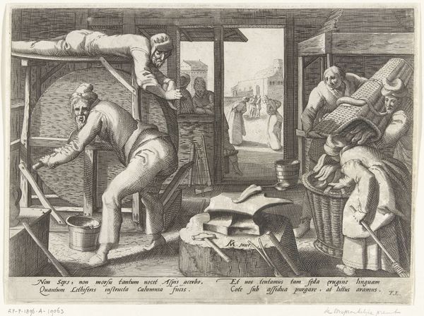 Editor: So, here we have Philips Galle’s "Vision of Cornelius," an engraving that could date anywhere between 1582 and 1676. It's housed at the Rijksmuseum. It's incredible the level of detail achieved through the engraving technique. The architectural elements feel quite imposing and dominate the scene. What strikes me most is how the angel almost blends into the background; it doesn't immediately grab your attention. How do you interpret this work? Curator: I see a powerful intersection of the earthly and the divine. Galle is invoking the visual language of revelation, a recurring theme in religious art. Notice how the architecture represents order, law, and the earthly realm – Roman authority embodied, even the statue, perhaps, a symbol of power. Editor: It’s interesting you mention that. Is the setting significant to the narrative? Curator: Absolutely. This is not just any space; it’s Cornelius's space, a Roman centurion. The angel appearing within that context is disruptive, a force breaking through established order. Angels frequently carry the burden of disruption. Editor: So, the statue and classical architecture are essentially symbols of worldly power disrupted by the angel? Curator: Precisely! And consider Cornelius himself – his posture, his gaze. He’s seated, receptive, but also somewhat unsure. It’s the moment before transformation. Note too, the bare feet on both Cornelius and the angel – representing a transition, vulnerability perhaps? Editor: That’s a great point. The bare feet do speak to a form of humility. It’s much more nuanced than I initially perceived. I was just focusing on the architectural composition. Curator: Galle has presented an exquisite convergence of symbol, story, and belief within a single print. Editor: Thanks. It has opened my eyes to seeing far beyond the lines and shading and towards the more interesting questions this work raises about authority, religion and identity.