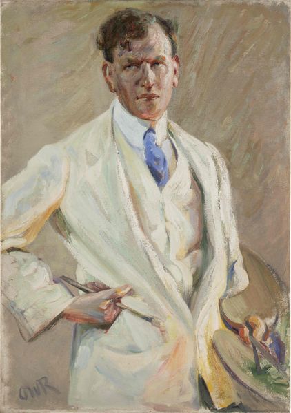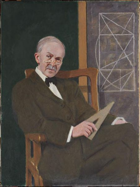 Editor: Here we have Marjorie Acker Phillips’ oil on canvas painting, "Portrait of Duncan". It gives me a rather sedate feeling, like a snapshot of domestic contentment. What do you see in this piece? Curator: I see a potent visual statement about gender and societal roles in the early to mid-20th century. Phillips paints a portrait that seems, at first glance, conventionally domestic, but when we look closely, we need to ask ourselves about the male gaze within a rapidly changing society and the gender dynamics therein. Editor: How so? The subject just seems like a man reading a newspaper. Curator: Exactly. What’s missing? Where is the female figure in this supposedly domestic scene? Consider also the historical moment. Phillips painted during a time of significant social change, especially regarding women’s roles. By showing us the *absence* of the woman, could Phillips be commenting on women’s often overlooked labor and contributions to the home and to society? Where does this leave Mr. Duncan within his societal framework? Editor: That's a fascinating perspective. So, instead of just seeing a man at leisure, we should also consider the power dynamics and unspoken narratives surrounding gender at the time. What do you think the dogs represent? Curator: Perhaps symbols of the domestic sphere and the expectation of companionship. How does this compare to a man in a home today, without children and with companion animals? Editor: I never considered looking at a portrait quite like that before, I always looked to who the work presented, not who it omitted. I'm very grateful for the viewpoint. Curator: It’s crucial to examine what isn’t immediately apparent to truly grasp an artwork’s power and social implications. Now it is my turn to thank you.